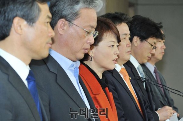 새정치민주연합 이완구 총리 후보자 인사청문특별위원회 위원들이 12일 오후 서울 여의도 국회 정론관에서 자회견을 갖고 임명 동의안을 강행하려는 새누리당을 비판하고 있다.