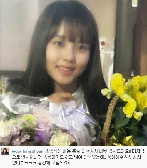 배우 김소현(17)이 중학교를 졸업한 소감을 전했다.김소현은 12일 자신의 인스타그램에 "졸업식에 많은 분들 와주셔서 너무 감사드려요"라며 "마지막으로 인사하니까 속상하기도 하고 많이 아쉬웠는데 축하해주셔서 감사합니다. 즐겁게 보낼게요"라는 글과 함께 사진을 올렸다.김소현은 이날 경기도 용인 문정중학교에서 진행된 졸업식에 참석했다.공개된 사진 속 김소현은 꽃다발을 들고 자연스러운 미소를 짓고 있다. 특히, 직찍임에도 예전보다 훨씬 성숙한 분위기와 빛나는 청순미모가 눈길을 사로잡는다.한편, 김소현은 현재 MBC 음악 프로그램 '쇼! 음악중심' MC로 활약하고 있다.[김소현 졸업 소감, 사진=김소현 인스타그램]