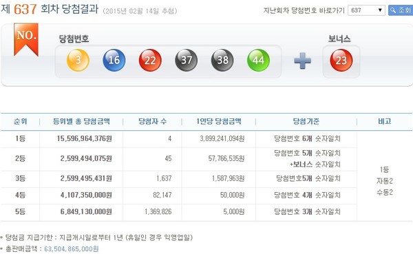 2015년 2월 14일 실시된 제637회 나눔로또 1등 당첨번호는 '3, 16, 22, 37, 38, 44'이며, 2등 보너스 번호는 23번이다.이번 로또 637회차 추첨 결과 1등 당첨자는 4명으로 38억9924만1094원의 당첨금을 받게 됐다.1등 번호 중개와 보너스 번호를 맞힌 2등은 45명이며, 1인당 5776만6535원씩 지급받는다. 당첨번호 중 5개를 맞힌 3등은 1637명으로 당첨금은 각 158만7963원이다.5만원의 당첨금을 받는 4개의 번호를 맞힌 4등은 8만2147명이며, 5000원의 고정 당첨금을 받는 5등은 136만9826명이 나온 것으로 집계됐다.한편, 이번주 로또637 총 판매금액은 635억486만5000원이다.[로또637회당첨번호, 사진=로또 홈페이지 캡처]