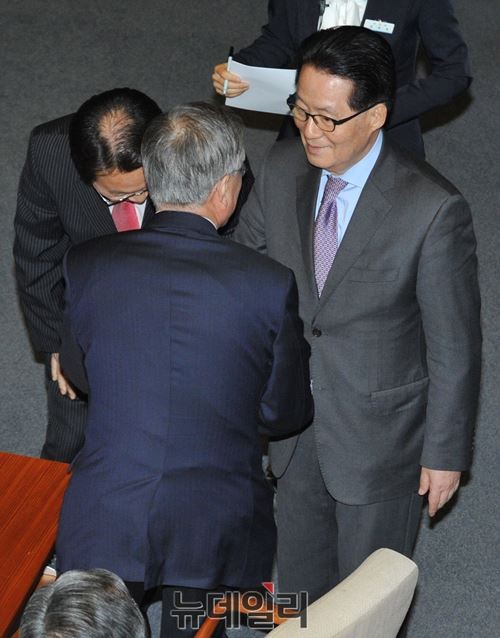 문재인 새정치민주연합 대표와 박지원 의원이 16일 오후 서울 여의도 국회에서 열린 이완구 국무총리 후보자 임명동의안 표결을 위한 본회의에서 대화를 나누고 있다.