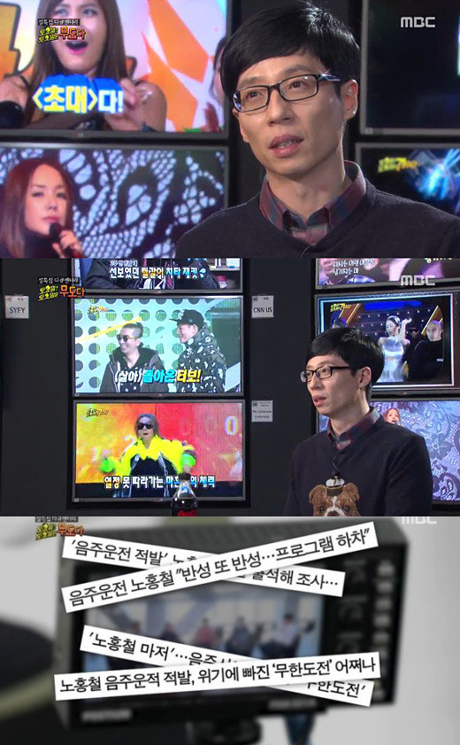 '무한도전' 멤버들이 노홍철의 음주운전 사건에 대해 입을 열었다.지난 20일 방송된 MBC '토요일 토요일은 무도다'에서는 '무한도전'에서 진행한 '토요일 토요일은 가수다'(이하 '토토가') 특집 비하인드 스토리를 공개했다.이날 방송에는 지난해 음주운전 사건으로 '무한도전'에서 하차한 노홍철이 깜짝 등장했으며, 노홍철이 하차한 이후의 첫 녹화현장이 공개돼 눈길을 끌었다.하하는 "새벽에 친구들에게 전화가 와서 들었던 것으로 기억한다"며 "그 당시 어떻게 지나갔는지 모르겠다. 생각이 잘 나지 않는다"고 털어놨다.이어 유재석은 "설마 했다. '너무 잘 알고 있을 텐데 이게 뭐지' 싶었다"고 떠올렸고, 정준하는 "많이 아팠다. 날개를 다쳐서 우리가 더 이상 날아오르지 못할 거란 생각이 들 정도였다"고 고백했다.['토요일 토요일은 무도다' 유재석 노홍철 언급, 사진=MBC '토토무' 방송 캡처]