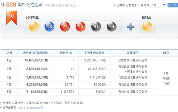 2015년 2월 21일 실시된 제638회 나눔로또 1등 당첨번호는 '7, 18, 22, 24, 31, 34'이며, 2등 보너스 번호는 6번이다.이번 로또 638회차 추첨 결과 1등 당첨자는 7명으로 22억2940만3179원의 당첨금을 받게 됐다.1등 번호 중개와 보너스 번호를 맞힌 2등은 41명이며, 1인당 6343만8302원씩 지급받는다. 당첨번호 중 5개를 맞힌 3등은 1719명으로 당첨금은 각 151만3072원이다.5만원의 당첨금을 받는 4개의 번호를 맞힌 4등은 8만4781명이며, 5000원의 고정 당첨금을 받는 5등은 142만2596명이 나온 것으로 집계됐다.한편, 이번주 로또638 총 판매금액은 643억1958만6000원이다.[로또638회당첨번호, 사진=로또 홈페이지 캡처]