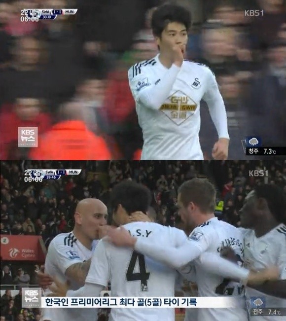 【뉴데일리 스포츠】기성용(26·스완지시티)이 시즌 5호골을 터뜨렸다.기성용은 21일(현지시간) 2014-2015 잉글랜드 프로축구 프리미어리그 26라운드 맨체스터 유나이티드와의 홈 경기에서 전반 30분 시즌 5호골을 넣으며 팀 승리를 이끌었다.이날 기성용은 1대 0으로 끌려가던 전반 30분 왼쪽 측면에서 올라온 크로스를 왼발로 방향만 바꿔놓는 슛으로 동점을 만들었다.후반 3분에는 골키퍼 데 헤아와 1대 1로 맞서는 등 위협적인 움직임을 보여줬다. 또, 후반 존조 셸비의 결승골에도 기여하며 2대-1 승리를 주도했다.이로써 올 시즌 5호골을 넣은 기성용은 박지성과 이청용이 갖고 있는 한국인 프리미어리그 한 시즌 최다골과 타이를 이뤘다. 앞서 박지성은 2006-2007시즌과 2010-2011시즌 두 차례 정규리그 경기에서 5골 기록을 세운 바 있다.영국 스카이스포츠는 최고의 활약을 펼친 선수에게 주어지는 '맨 오브 더 매치'에 기성용을 선정했으며, 이와 함께 양팀 통틀어 가장 높은 평점 8을 부여했다.[기성용 골, 사진=KBS2 뉴스 영상 캡처]