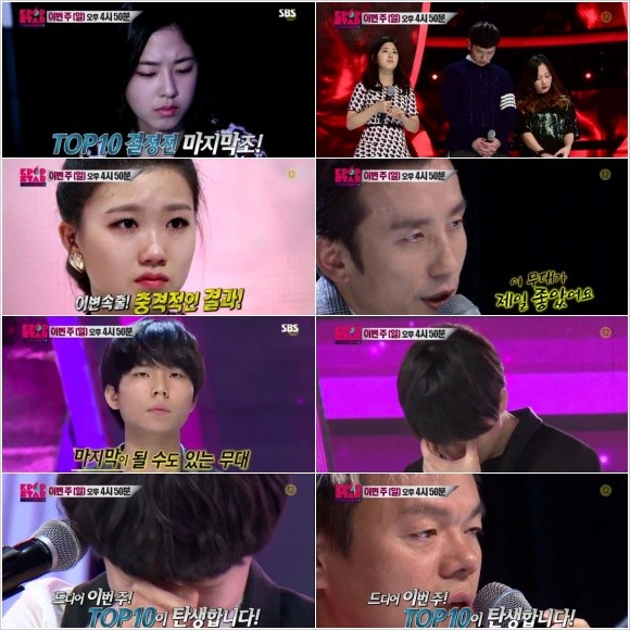 'K팝스타4'(케이팝스타4)가 대망의 TOP10 진출자를 결정짓는 '배틀 오디션'의 마지막 방송을 앞두고 또다시 눈물바다 무대를 예고했다.22일 방송될 SBS '일요일이 좋다-서바이벌 오디션 K팝스타 시즌4'(이하 'K팝스타4') 14회에서는 '배틀 오디션' 5조, 6조의 경합 결과와 함께 2위 팀들의 재대결이 펼쳐진다. 마지막 관문을 앞두고 심사위원들도 곤혹스러울 만큼 이변 속출이 예고되면서, 과연 어떤 참가자가 TOP10의 자리에 오르게 될 지 호기심을 증폭시키고 있다.이와 관련 지난 20일 SBS 공식 홈페이지와 포털사이트 네이버 TV캐스트에 올라온 'K팝스타4' 14회 예고 영상에는 2위 재대결 무대에서 눈물을 터트리거나, 경직된 채 고개를 푹 숙이고 있는 참가자들의 모습이 담겨, 그 이유에 대해 궁금증을 높인다.무엇보다 14회 방송에서는 '배틀 오디션'에서 예상을 뒤집고 2위를 기록하고만, 막강 실력파들의 초박빙 2위 재대결이 초미의 관심을 모은다. '배틀 오디션'에서 2위를 기록, 충격을 안겨줬던 정승환이 재대결 무대에서 역시 고개를 숙인 채 낙담한 듯한 모습을 보이고 있는 것. 예고편을 접한 시청자들은 "말도 안돼! 정승환이 떨어지는 일은 없겠지?", "정승환, YG에 준 와이드 카드로 살아나는 거 아니었어? 표정 때문에 불안해!"라며 가늠할 수 없는 결과에 불안감을 내비치고 있다.뿐만 아니라 혼성 듀엣 '지존'(장미지, 존추)의 멤버 장미지가 무대 위에서 얼굴을 들지 못한 채 펑펑 오열하는 모습도 담겨, 눈물의 의미에 대한 의견이 분분하다. 더욱이 심사위원들 또한 예측을 빗겨간 결과에 당혹스러움을 내비치는 모습이 펼쳐지면서 이목이 집중되고 있다.양현석은 "이변이 많네요", "아직 결정된 거 아닙니다"라고 혼란스러운 심정을 내비쳤고, 유희열은 "이 무대가 제일 좋았어요"라고 호평을 전하기도 했다. 결승전을 방불케 하는 재대결의 압박을 이겨내고 TOP10에 오를 주인공이 누구일지 시선이 쏠리고 있다.그런가하면 14회 방송에서는 아직 경합을 치르지 않은 '배틀 오디션' 5, 6조의 결과도 밝혀질 예정이어서 눈길을 끈다. 5조에서는 이진아와 에스더김이 경연을 벌였고, 에이다웡의 순서가 남아있는 상태. 이진아는 자작곡 '냠냠냠'으로 심사위원들에게 호평을 받았고, 200만 뷰를 기록하는 기염을 토했다. 하지만 '막강 기대주'로 꼽혀왔던 에스더김도 심사위원들의 칭찬을 받은 데다, 아직 에이다웡의 무대가 펼쳐지지 않은 만큼, 결과에 귀추가 주목된다.더불어 6조에서 또한 박진영을 녹여버린 짙은 흑인 감성 이봉연과 극적으로 안테나 뮤직에 캐스팅된 박혜수, 모태 소울 감성으로 양현석을 감탄케 했던 케이티 김이 긴장감 넘치는 '마지막 배틀'에 나서게 되는 터. 5, 6조에서는 과연 누가 1위를 차지해 7개가 남은 TOP10 자리에 직행할 수 있을 지 기대감을 높이고 있다.제작진 측은 "어렵게 단 한 번의 기회를 갖게 된 무대인만큼 2위 재대결은 보는 이들도 긴장할 수밖에 없었다"며 "2위 팀들이 혼신을 다해 보여주는 무대가 안방극장에 감동을 안겨줄 것"이라고 전했다.한편, TOP10 진출자가 결정되는 SBS 'K팝스타4'(케이팝스타4) 14회는 22일 오후 4시 50분에 방송된다.['K팝스타4' 정승환 장미지 , 사진=SBS 'K팝스타4' 방송 캡처]