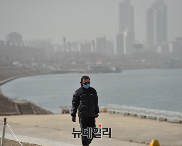 전국에 황사 주의보가 발효된 가운데 23일 오후 한강공원들에서 한 시민이 마스크를 착용한 채 걷고 있다.
