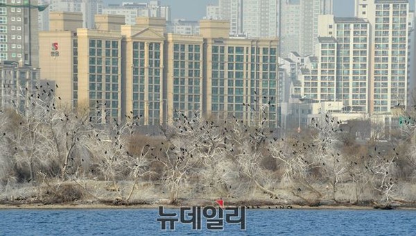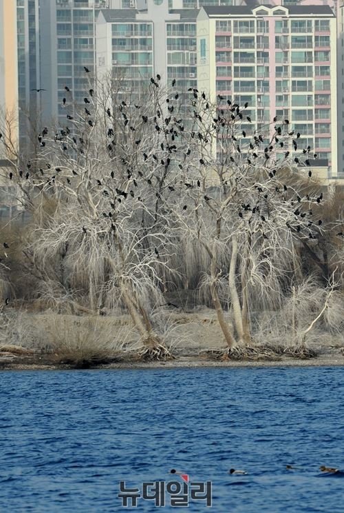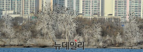 23일 오후 서울 여의도 한강 밤섬에 서식하는 민물 가마우지 무리의 배설물로 버드나무가 눈꽃이 핀 것 처럼 백화현상을 일으키고 있다.