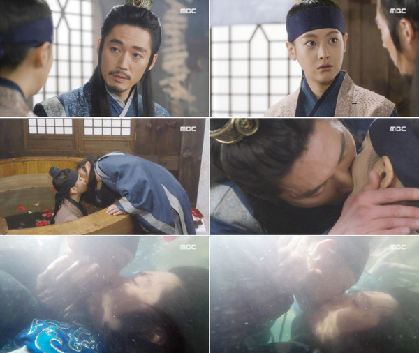 서로의 마음을 확인하며 더없이 행복한 순간 백묘(김선영)가 갑자기 욕실에 들어섰고, 이에 놀란 신율은 왕소를 욕조 안으로 끌어 당겨 위기를 모면했다. 백묘가 욕실을 나가자 왕소는 신율을 물 속으로 끌어당겨 호흡을 나누는 로맨틱한 수중 키스로 시청자들의 마음을 두근거리게 했다.