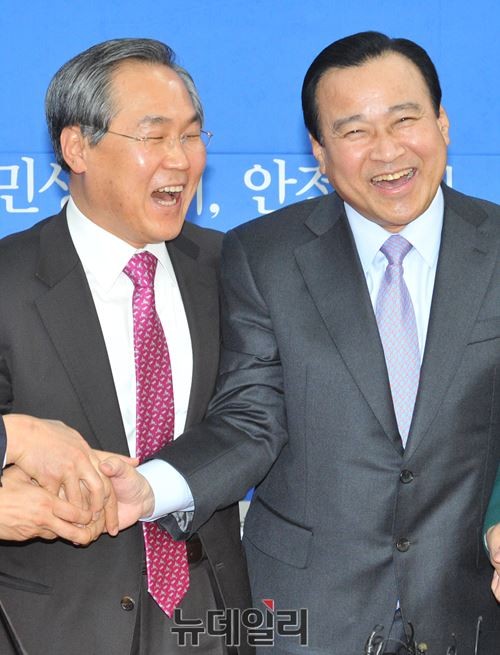 이완구 국무총리가 24일 오전 국회를 찾아 새정치민주연합 우윤근 원내대표를 만난 자리에서 기념 촬영을 하고 있다.