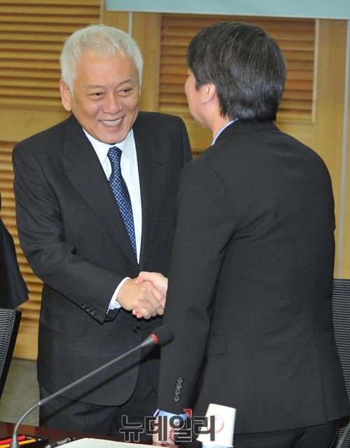 새정치민주연합 안철수 의원과 김한길 의원이 25일 국회에서 열린 [박영선·안철수가 말하는 경제성장을 위한 공정한 시장경쟁 좌담회]에서 인사하고 있다.