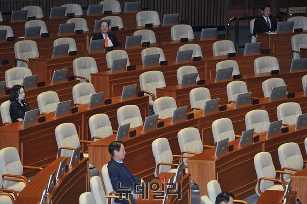 25일 오후 서울 여의도 국회의당에서 열린 [정치.외교.통일.안보]에 관한 대정부 질문이 진행되는 가운데 본회의장이 텅 빈 모습을 보이고 있다.