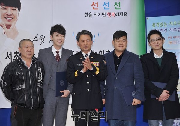 스윗소로우 인호진이 27일 오전 서울 서초구 서초경찰서에서 매니저 김성현씨와 소속사 김인호 과장과 함께 감사장을 받았다. 세 사람은 지난 19일 심야에 서초경찰서 앞 횡단보도를 건너던 50대 부부를 치고 달아나는 권모(28)씨의 프라이드 승용차를 발견하고 추격한 끝에 권씨를 붙잡아 경찰에 넘겼다.이날 경찰은 감사장 수여와 함께 스윗소로우 인호진을 서초서 '선 지킴이' 홍보대사로 위촉했다.
