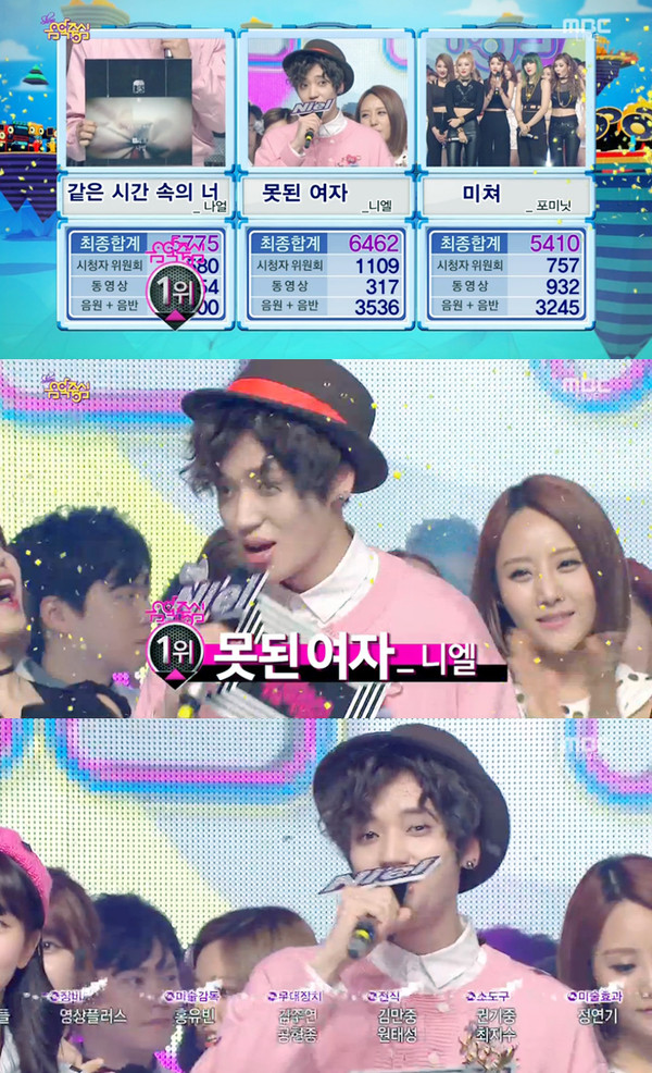 첫 솔로 앨범으로 인기를 입증하고 있는 틴탑 니엘이 '음악중심'에서 1위를 차지했다.니엘은 28일 방송된 MBC '쇼! 음악중심'에서 타이틀곡 '못된 여자'로 함께 1위 후보에 올랐던 포미닛과 나얼을 제치고 영광의 1위에 오를 수 있었다.1위에 오른 니엘은 방송에서 "티오피미디어 식구들, 스텝 분들, 러너 형, 블랙아이드필승 형들, 그리고 앤디 형, 신화 형들 다들 너무너무 감사합니다!!!"라는 소감을 말하며 감사의 기쁨을 전했다.특히 이번 '음악중심'에서의 1위는 지난 27일 KBS2 '뮤직뱅크'에 이은 두 번째 1위로 틴탑에서 첫 솔로 앨범을 발매한 니엘에게 더욱 뜻 깊은 의미를 지닌다.한편, '뮤직뱅크'와 '음악중심'까지 연이은 1위를 차지한 니엘은 타이틀곡 '못된 여자'로 많은 사랑을 받고 있다.[음악중심 니엘, 사진=MBC '쇼음악중심' 방송 캡처]