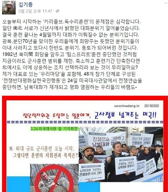 2013년 3월에는 정부서울청사 앞에서 열린 ‘한반도 평화수호 각계 사회단체 긴급 기자회견’에 참석해 反美활동가돌과 함께 “전쟁을 부르는 韓美합동군사훈련의 중단을 호소한다”, “이 땅을 전쟁전야로 만든 미국은 연례적인 방어연습이라는 기만을 거둬라” 등의 주장을 펼치기도 했다.