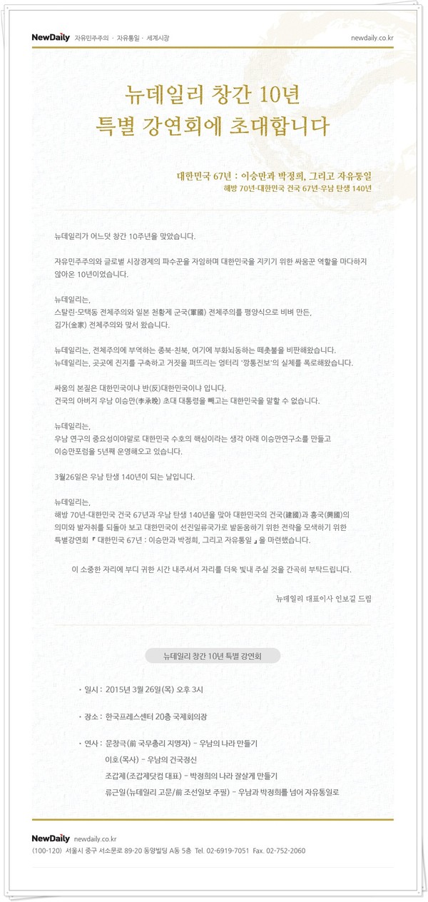 광복 70년-대한민국 건국 67년-우남 탄생 140년-뉴데일리 창간 10년 기념 특별강연회