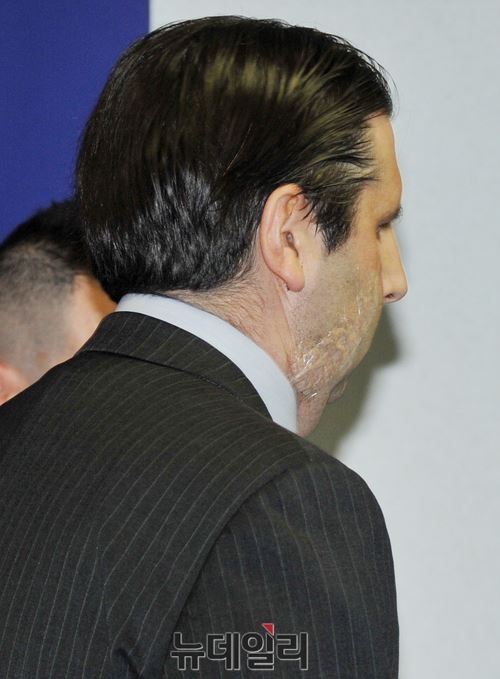 지난 5일 오전 세종문화회관에서 열린 행사에 참석 중 김기종에게 테러를 당해 입원 중이던 마크 리퍼트 주한 미국 대사가 10일 오후 서울 서대문구 신촌세브란스 병원에서 기자회견을 갖고 퇴원 소감을 밝힌 후 퇴장하고 있다.