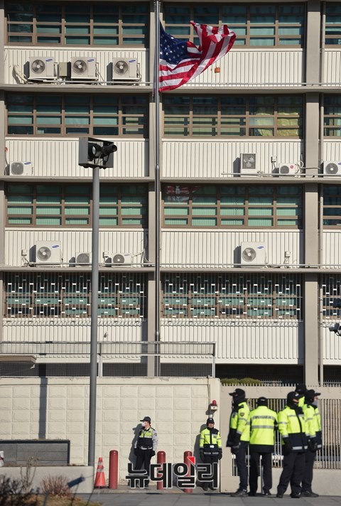 서울 종로구에 위치한 주한 미국 대사관 주변이 10일 오후 경계가 강화돼 경찰이 근무를 서고 있다.