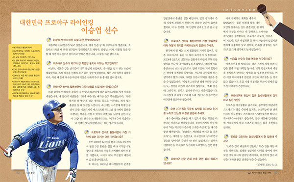 이승엽은 이에 대해 "교과서에 인터뷰가 실리다니, 기쁜 일이다. 특히 어린 학생들의 교과서에 내가 나온다는 게 너무나 큰 영광이다. 야구를 계속 잘해야겠다. 내 아이들에게도 꼭 보여주고 싶다"고 말했다.