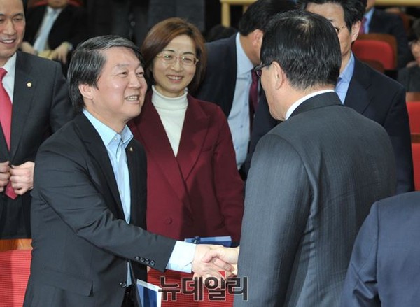 새정치민주연합 안철수 의원이 11일 오후 서울 여의도 국회 의원회관에서 열린 더미래연구소 창립식 및 창립기념 토론회에서 정의화 국회의장과 인사를 나누고 있다.
