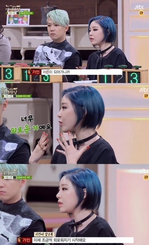 '마녀사냥' 가인이 외로움을 토로했다.가인은 13일 방송된 JTBC '마녀사냥'에 출연해 "20대 초반에는 모임이 있어도 잘 나가지 않고 집에 있는걸 좋아했는데 요즘엔 좀 바뀌었다"고 털어놨다.이어 "모임도 자주 찾게 되고 누가 부르면 나가게 된다. 서른 살이 가까워져 그런지 조금씩 외로워지기 시작한다. 공허하다. 그건 남자친구와 상관없는 외로움이다"고 밝혔다.도한, 이날 가인은 올누드 남성들과 촬영한 뮤직비디오에 대해 설명하고 깜짝 댄스타임으로 MC들을 녹이는 등 돋보이는 활약을 펼쳤다.[마녀사냥 가인, 사진=JTBC '마녀사냥' 방송 캡처]