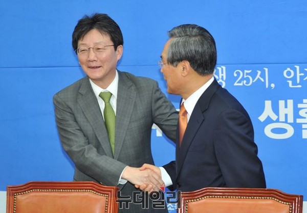 새누리당 유승민 원내대표가 16일 오전 서울 여의도 국회에서 새정치민주연합 원내대표실에서 열린 여야 주례회동에서 새정치민주연합 우윤근 원내대표와 악수를 나누고 있다.