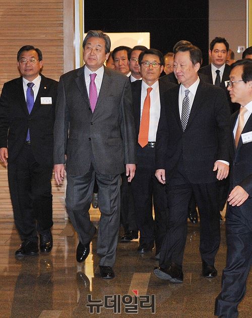 새누리당 김무성 대표와 박용만 대한상공회의소 회장이 16일 서울 중구 대한상공회의소 국제회의장에서 열린 '새누리당-대한상공회의소 정책간담회'에 입장하고 있다.