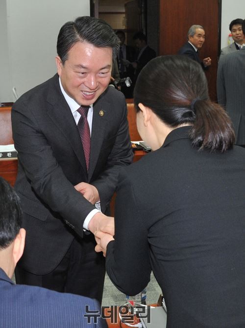 강신명 경찰청장이 17일 오전 서울 여의도 국회 국민안전혁신 특별위원회 전체회의에 출석해 새정치민주연합 권은희 의원과 인사를 나누고 있다.