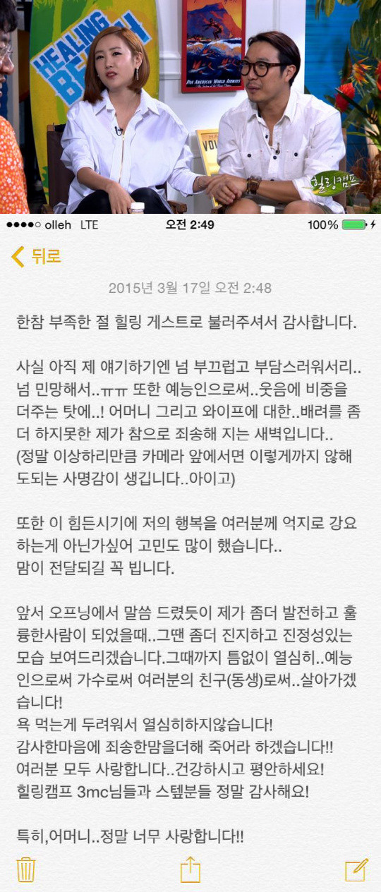 하하가 '힐링캠프' 출연 소감을 밝혔다.하하는 17일 자신의 트위터에 한참 부족한 저를 '힐링캠프' 게스트로 불러 주셔서 감사하다. 사실 아직 제 얘길하기엔 부끄럽고 부담스럽다"고 말문을 열었다.그는 "너무 민망하고 예능인으로서 웃음에 비중을 더 주는 까닭에 어머니와 아내에 대한 배려를 못해 죄송하다"며 "이 힘든 시기에 저의 행복을 여러분께 억지로 강요하는 게 아닌가 싶어 고민도 많이 했다"고 털어놨다.이어 "앞서 오프닝에서 말했듯 제가 좀 더 발전하고 훌륭한 사람이 됐을 때 진지하고 진정성 있는 모습 보여드리겠다. 그때까지 틈없이 열심히 예능인으로서 가수로서 여러분의 친구 동생으로서 살아가겠다"고 덧붙였다.마지막으로 하하는 "욕 먹는 게 두려워서 열심히 하지 않았다. 감사한 마음에 죄송한 마음을 더해 죽어라 하겠다. 여러분 모두 사랑한다. 건강하고 평안하시길. '힐링캠프' 3MC와 스태프들 정말 감사하다. 특히 어머니 정말 사랑한다"고 전했다.['힐링캠프' 하하 출연 소감, 사진=SBS/ 하하 트위터]