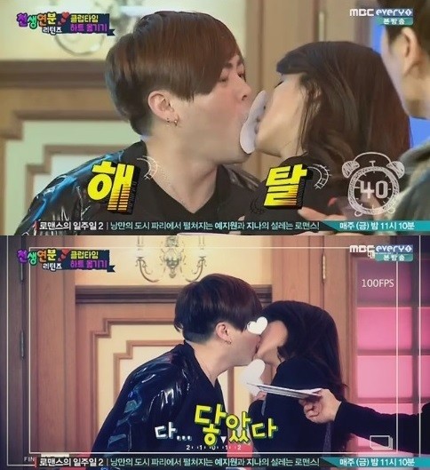 문희준과 후지이 미나가 게임 중 농도 짙은 스킨십을 선보였다.17일 방송된 MBC에브리원 '천생연분 리턴즈'에서는 테마파크로 떠난 남녀 출연자들의 실전 '러브 타임'과 함께 아찔한 클럽 분위기 속에서 진행되는 '클럽 타임' 코너가 공개됐다.이날 클럽 타임에서는 입술로 하트를 옮기는 '뽀뽀뽀 게임'을 진행했다. 많은 커플들이 아슬아슬한 타이밍으로 키스의 위기(?)를 넘긴 가운데, 돌발 키스를 하게 된 커플도 있었다. 바로 문희준과 후지이 미나 커플.입술로 종이 하트를 옮기던 문희준과 후지이 미나는 하트가 떨어지며 순식간에 입술이 닿으며 키스를 하게 되었고, 두 사람의 아찔한 키스 장면에 지켜보던 모든 출연자들은 놀라움을 금치 못했다.예상치 못한 키스에 얼굴이 빨개진 두 사람은 부끄러움에 눈도 못 마주쳤지만 내심 싫지만은 않은 눈치. 문희준은 "솔직히 행복한데 미안하다"고 밝혔고, 후지이 미나는 "뭔지 모르겠다"고 당황하는 모습을 보였다.[문희준 후지이 미나, 사진=MBC에브리원 '천생연분 리턴즈' 방송 캡처]