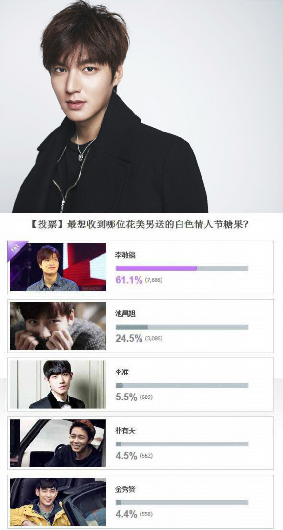 배우 이민호가 중국에서 '화이트데이의 남자'로 등극했다.이민호는 지난 14일 중국의 한류페이지 엠웨이브(Mwave)가 3월 3일부터 3월 12일까지 진행된 '화이트 데이, 당신은 어떤 꽃미남에게 가장 사탕을 받고 싶나요?' 투표 결과에서 전체 61.1%의 압도적인 득표율을 기록하며 1위를 차지했다.61.1%(7686표)의 득표율로 1위에 등극한 이민호 외에도 지창욱 24.5%(3086표), 이준 5.5%(689표), 박유천 4.5%(562표), 김수현 4.4%(558표)가 이름을 올렸다.이에 네티즌들은 "축하해요 이민호", "완벽하고 섹시한 우리 키다리 오빠", "화이트 데이에 함께만 해준다면" 등의 뜨거운 반응을 보였다.한편, 지난 1월 유하 감독의 거리 3부작 완결판인 '강남 1970'에 출연, 2015년 한국 영화 최초 200만 관객을 돌파하고 14개국에 수출하는 흥행 성적을 거두었으며, 현재 신중하게 차기작을 검토 중에 있다.