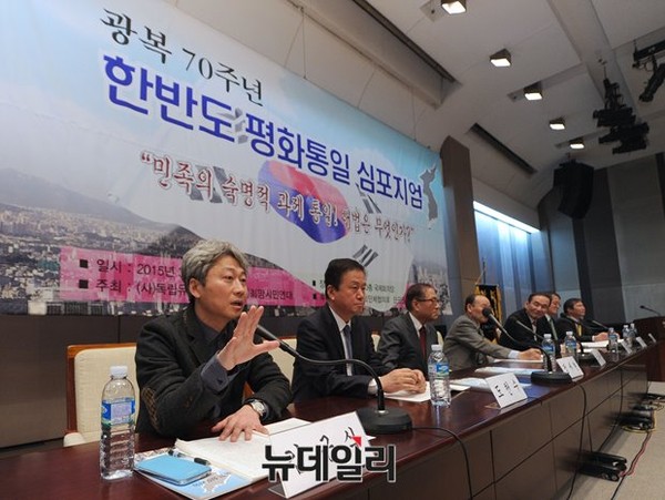독립유공자유족회와 희망시민연대가 공동 주최하는 [광복 70주년 한반도 평화통일 심포지엄]이 '민족의 숙명적 과제 통일 해법은 무엇인가'를 주제로 18일 오전 서울 중구 태평로 한국프레스센터에서 열렸다.