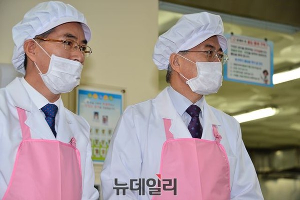 문재인 새정치민주연합 대표가 18일 경남 창원 반송초등학교 급식소에서 박종훈 경남도교육감과 급식 봉사를 하고 있다.