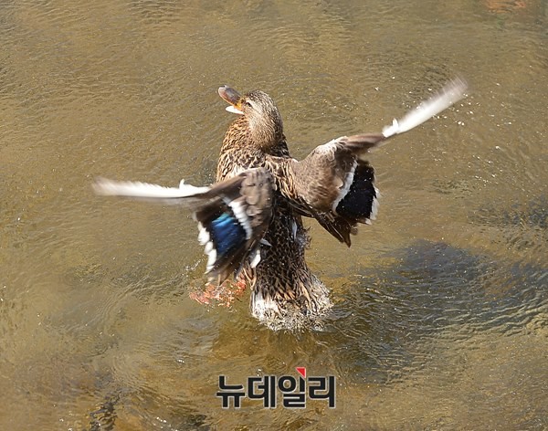 19일 정오 서울 종로구 청계천에 오리가 힘찬 날갯짓을 하고 있다.