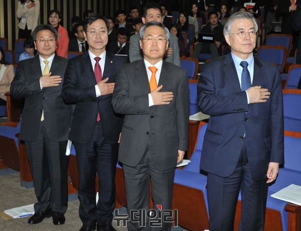 새정치민주연합 문재인 대표와 지도부가 19일 오전 서울 여의도 국회에서 열린 정책의총에서 국민의례를 하고 있다.