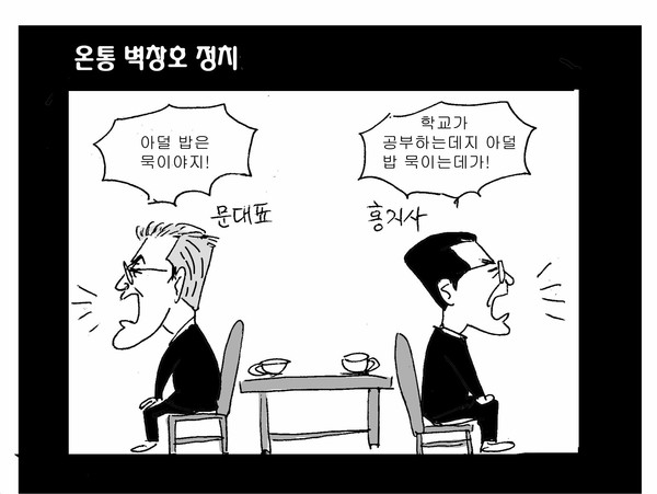 만평 "여기가 아덜 밥 묵이는데가!" vs. "아덜 밥은 묵이야지"