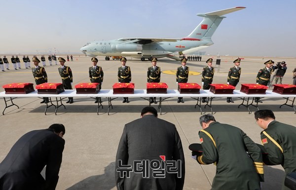 앞서 국방부는 지난 16일 경기도 파주시에 위치한 '중국군 유해 임시안치소'에서 두농이(DU NONG YI) 주한중국대사관 국방부장과 중국측 관계자들이 참석한 가운데 입관식 행사를 가졌다.
