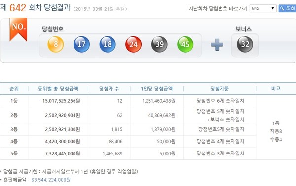 2015년 3월 21일 실시된 제642회 나눔로또 1등 당첨번호는 '8, 17, 18, 24, 39, 45'이며, 2등 보너스 번호는 32번이다.이번 로또 642회차 추첨 결과 1등 당첨자는 12명으로 12억5146만438원의 당첨금을 받게 됐다.1등 번호 중개와 보너스 번호를 맞힌 2등은 62명이며, 1인당 4036만9692원씩 지급받는다. 당첨번호 중 5개를 맞힌 3등은 1815명으로 당첨금은 각 137만9020원이다.5만원의 당첨금을 받는 4개의 번호를 맞힌 4등은 8만8406명이며, 5000원의 고정 당첨금을 받는 5등은 146만5689명이 나온 것으로 집계됐다.한편, 이번주 로또642 총 판매금액은 635억4422만4000원이다.[로또642회당첨번호, 사진=로또 홈페이지 캡처]