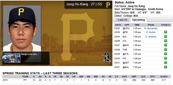 피츠버그 주전 내야진과 힘든 경쟁을 벌이고 있는 강정호 입장에서 경기에 내리 나가지 못하는 것은 큰 타격이 될 수 있다. 지금까지 시범경기 10경기에 출전한 강정호는 23타수 3안타로 타율 0.130에 그치고 있으며 수비 역시 유격수, 3루수, 2루수를 돌며 정착하지 못하고 있다.