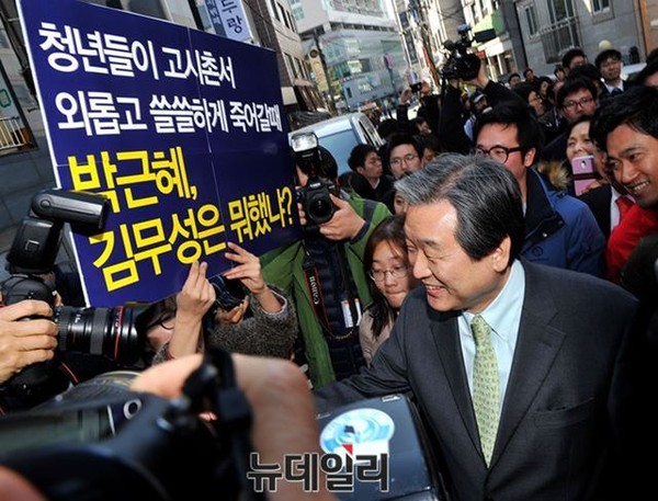 새누리당 김무성 대표가 23일 오후 서울 관악구 신린동 고시촌에서 청년들과 타운홀 미팅을 갖기 위해 행사장으로 이동하는 중 핏켓시위대에 둘러싸여 있다.