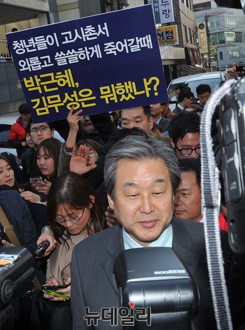 새누리당 김무성 대표가 23일 오후 서울 관악구 신린동 고시촌에서 청년들과 타운홀 미팅을 갖기 위해 행사장으로 이동하는 중 핏켓시위대에 둘러싸여 있다.