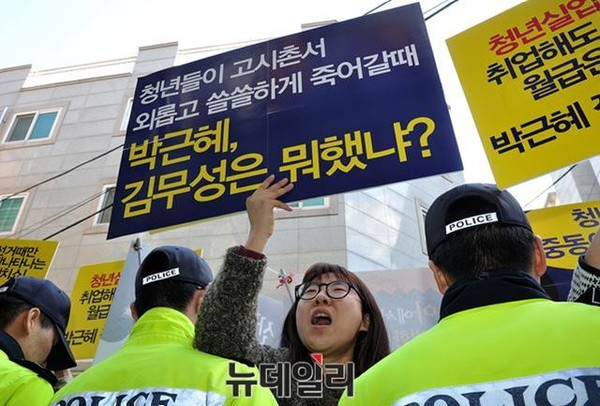 새누리당 김무성 대표가 23일 오후 서울 관악구 신린동 고시촌에서 청년들과 타운홀 미팅을 갖고 있는 가운데 시위대가