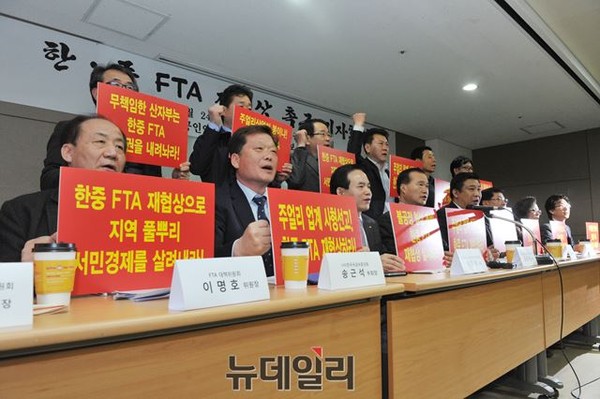 소상공인연합회와 한국귀금속보석단체장협의회가 25일 오전 서울 여의도 중소기업중앙회에서 기자회견을 갖고 '한-중 FTA 재협상 촉구하고 있다.