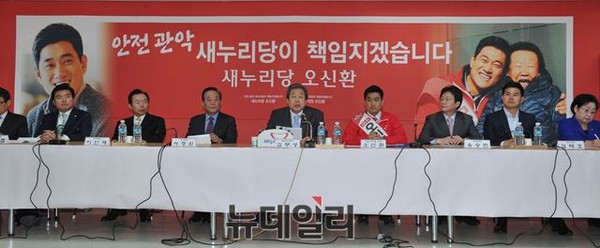 새누리당 김무성 대표와 지도부가 30일 오전 서울 관악구 조원동 4.29재보궐선거 오신환 후보의 선거사무소에서 열린 현장최고위원회의에 참석해 회의를 하고 있다.