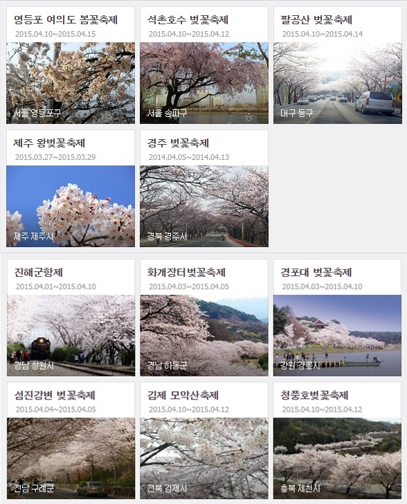 전국이 개화기에 접어듬에 따라 벚꽃 축제 일정이 네티즌들의 이목을 끌고 있다.우선 서울의 대표적인 벚꽃축제인 '석촌호수 벚꽃 축제'와 '여의도 벚꽃축제'는 다음달 4일부터 6일까지 진행된다. '석촌호수 벚꽃 축제'에서는 호수를 둘러싼 벚꽃 뿐만 아니라 개나리, 철쭉 등 다른 봄꽃들도 구경할 수 있다.이외에도 야외 미술 작품 전시회나 문화예술공연도 더해지면서 많은 볼거리가 있을것으로 예상된다.경주 역시 매력있는 벚꽃 여행지로 각광받고 있다. 다음 달 5일 부터 13일까지 보문 관광단지를 비롯한 동부사적지, 흥무공원, 금장대 일원 등지에서 벚꽃 축제가 열린다.특히, 보문단지 순환도로는 드라이브 코스로 좋은 평가를 받고 있으며, 호수길과 정자도 걷기 좋은 데이트 코스다. 안압지는 밤이 되면 조명에 비춰진 다른 매력을 느낄 수 있다.또한 경주는 다른 관광명소 역시 많다. 첨성대, 계림 등 역사 유적 명소를 함께 둘러볼 수 있어 더 알찬 여행을 계획할 수 있다.