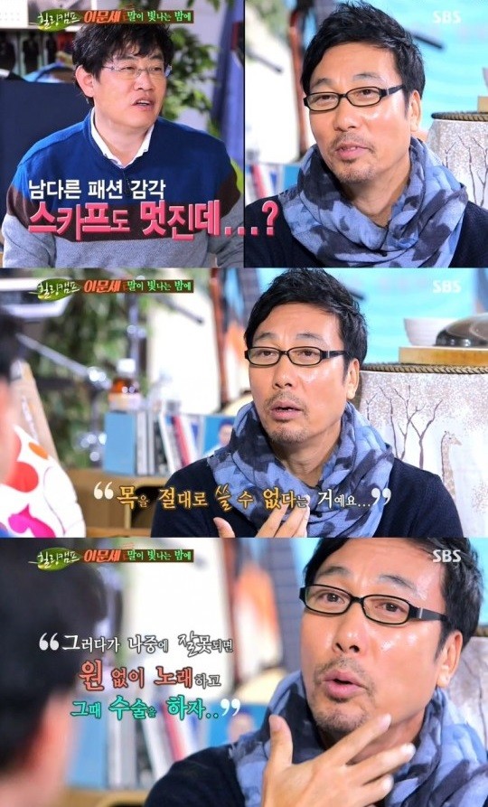 하지만 이문세는 갑자기 어두워진 얼굴로 "스카프는 목을 보호하기 위해서 한 거다. 사실 이번 수술 전에 의료진이 '암 덩어리가 성대에 거의 붙어있다'고 말했다"며 암 투병사실을 털어놨다.