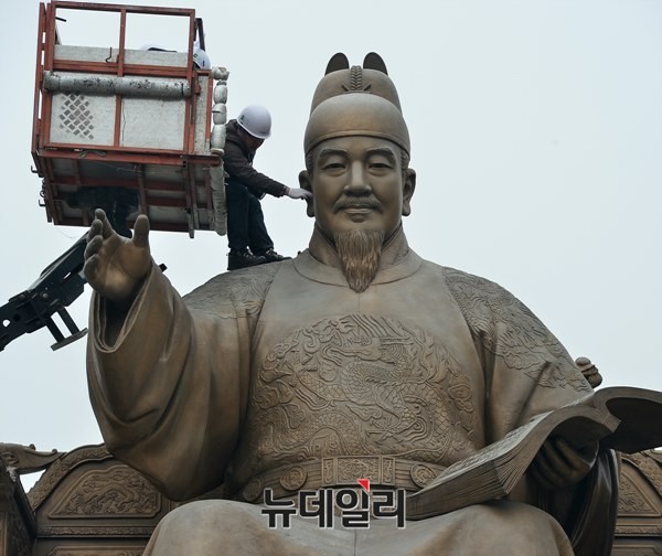31일 오후 서울 광화문광장에 설치된 세종대왕 동상을 서울시청 역사 도심 관리과 직원들이 점검하고 있다.