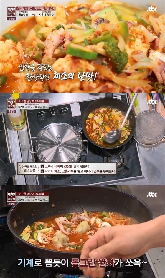 '중식의 대가' 이연복 셰프가 집에서 만들 수 있는 '완소짬뽕' 레시피를 공개했다.이연복 셰프는 지난 3월 30일 방송된 JTBC '냉장고를 부탁해'에 스페셜 게스트로 출연해 배우 이규한의 냉장고에 든 재료로 이원일 셰프와 요리 대결을 펼쳤다.이날 이연복은 요리대결 시간이 다가오자 제한시간 15분에 대한 부담감을 토로하면서도 "43년 짬뽕의 노하우를 보여주겠다"며 현란한 요리 퍼포먼스를 선보였다.이연복은 중식칼을 자유자재로 사용하는가하면, 재빠른 손놀림으로 순식간에 새우완자를 만들어내는 등 중식 대가다운 면모를 과시해 모두를 놀라게 했다.이연복 완소짬뽕은 고추와 대파에 간장을 넣어 볶다가 채소와 고춧가루, 면수, 낙지를 넣고 끓인다. 그는 이어 녹말가루, 새우, 달걀물을 섞어 동그란 완자를 만들어냈다.이연복은 셰프는 "포인트는 처음에 파, 마늘을 볶다가 그 안에 간장을 살짝 붓고 다시 볶는 거다. 향내를 확 나게 하고 짬뽕 국물의 감칠맛을 낼 수 있다"고 노하우를 전했다.[이연복 완소짬뽕 레시피, 사진=JTBC '냉장고를 부탁해' 방송 캡처]