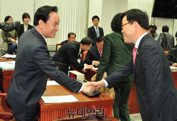 이병석 정치개혁특별위원장이 1일 오전 서울 여의도 국회의사당에서 열린 전체회의에서 새정치민주연합 김기식 의원과 인사를 나누고 있다.