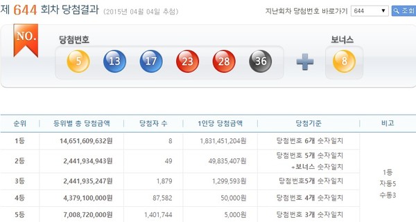 2015년 4월 4일 실시된 제644회 나눔로또 1등 당첨번호는 '5, 13, 17, 23, 28, 36'이며, 2등 보너스 번호는 8번이다.이번 로또 644회차 추첨 결과 1등 당첨자는 6명으로 18억3145만1204원의 당첨금을 받게 됐다.1등 번호 중개와 보너스 번호를 맞힌 2등은 49명이며, 1인당 4983만5407원씩 지급받는다. 당첨번호 중 5개를 맞힌 3등은 1879명으로 당첨금은 각 129만9593원이다.5만원의 당첨금을 받는 4개의 번호를 맞힌 4등은 8만7582명이며, 5000원의 고정 당첨금을 받는 5등은 140만1744명이 나온 것으로 집계됐다.한편, 이번주 로또644 총 판매금액은 618억8465만9000원이다.[로또644회당첨번호, 사진=로또 홈페이지 캡처]