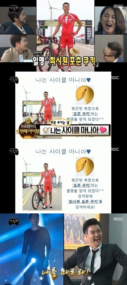 슈퍼주니어 최시원의 포춘쿠키가 화제다.지난 4일 방송된 MBC '무한도전'에서는 식스맨 최종 후보 5인 홍진경, 장동민, 강균성, 최시원, 광희가 한 자리에 모여 '만약 내가 무한도전 멤버가 된다면'이라는 주제로 기획안을 발표했다.이날 두 번째 발표자로 나선 최시원은 '나는 사이클 마니아'라는 제목과 함께 과거 흑역사 사진을 과감하게 공개했다.이를 본 멤버들은 "저게 뭐냐"며 박장대소 했고, 최시원은 "지켜주지 못한 사진들은 너무 좋아한다"라며 미국 리액션을 선보였다.공개된 사진 속 최시원은 주요부위가 도드라져 보인 채 환하게 웃고 있었다. 특히, PPT에는 '화끈한 복장으로 포춘쿠키라는 별명을 얻게 되었다. 검색창에 최시원 포춘쿠키를 검색하세요'라는 글이 눈에 띄었다.최시원은 무한도전 식스맨이 되기 위해 흑역사 사진을 당당히 소개하며 자신을 적극 홍보해 폭소를 자아냈다.[무한도전 최시원 포춘쿠키, 사진=MBC '무한도전' 방송 캡처]