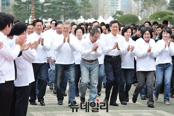 새정치민주연합 문재인 대표 와 지도부가 6일 오전 서울 여의도 국회에서 새정치민주연합 주최로 열린 정책엑스포에 입장하고 있다.